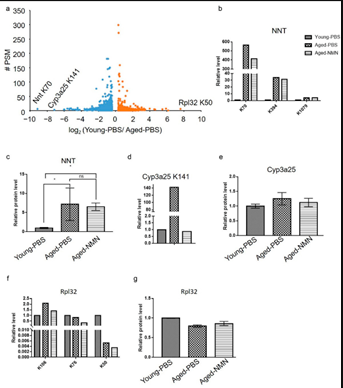 尤其是老年小鼠肝脏中NAD (P)转氢酶(NNT)在K70处显著超乙酰化,补充NMN不仅降低了乙酰化强度,而且还不影响蛋白水平。衰老肝脏中细胞色素3a25 (Cyp3a25)的乙酰化也显著增加,而补充NMN后完全阻止了这种增加。