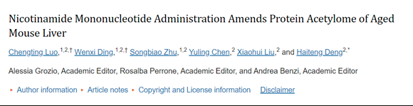 Luo C, Ding W, Zhu S, Chen Y, Liu X, Deng H. Nicotinamide Mononucleotide Administration Amends Protein Acetylome of Aged Mouse Liver.Cells.2022 May 16;11(10):1654.doi:10.3390/cells11101654.PMID:35626691; PMCID: PMC9139684.