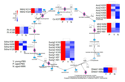 三羧酸循环(TCA)是需氧生物体内普遍存在的代谢途径,是三大营养素(糖类、脂类、氨基酸)的最终代谢通路,又是糖类、脂类、氨基酸代谢联系的枢纽。研究发现,参与三羧酸循环的酶在衰老的肝脏中也被高度乙酰化,而补充NMN却阻止了与年龄相关的高度乙酰化。