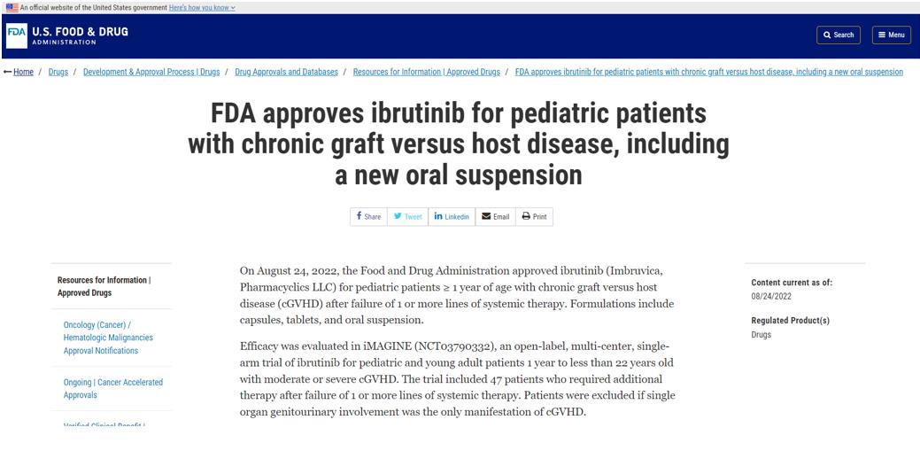 2022年8月24日,美国食品药品监督管理局(FDA)批准依鲁替尼(Ibrutinib)用于治疗1岁以上患有慢性移植物抗宿主病(cGVHD)的儿童患者,这些患者在接受1线或多线系统治疗失败后。此次获批的适应证主要针对的是儿童患者,第25周的总体反应率为60%,药物制剂包括胶囊、片剂和口服混悬剂。