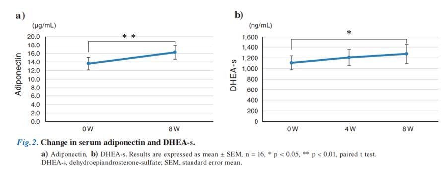 绝经后女性服用NMN (300 mg/day)8周后,脂联素从13.6增加到16.2µg/mL,硫酸脱氢表雄酮DHEA-s则从1108增加到1275 ng/mL。