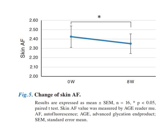 绝经后女性服用NMN (300 mg/day)8周后,皮肤中晚期糖基化终末产物(advanced glycationend products AGEs)数量的AF值从2.43降至2.35。