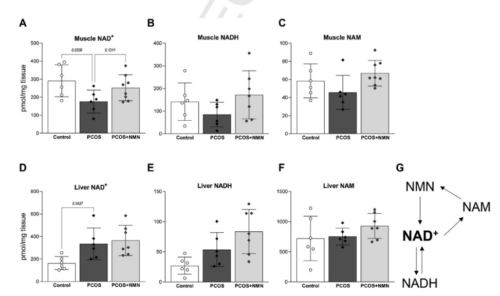 【概要描述】多囊卵巢综合症肌肉中NAD+水平显著降低,而通过补充NAD+的前体NMN后,减轻了多囊卵巢综合症的病情,这可能是治疗多囊卵巢综合症的潜在治疗策略。