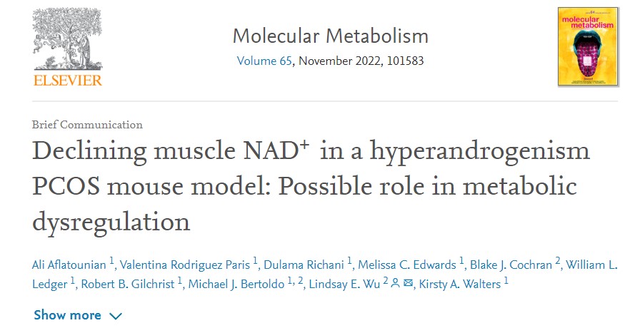 [1]. Aflatounian A, Paris VR, Richani D, Edwards MC, Cochran BJ, Ledger WL, Gilchrist RB, Bertoldo MJ, Wu LE, Walters KA. Declining muscle NAD+ in a hyperandrogenism PCOS mouse model: Possible role in metabolic dysregulation. Mol Metab. 2022 Sep 9;65:101583. doi: 10.1016/j.molmet.2022.101583. Epub ahead of print. PMID: 36096453.