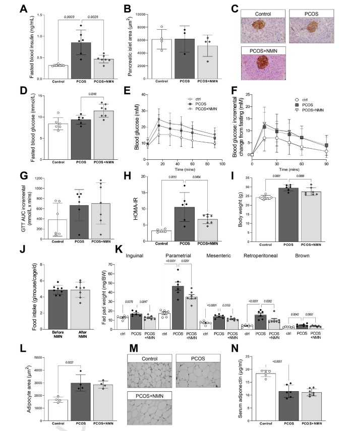 研究团队首先在青春期前后的雌性小鼠皮下植入二氢睾酮(DHT)来建立PCOS小鼠模型,然后通过NMN治疗8周后,通过空腹胰岛素和HOMA胰岛素抵抗检测、葡萄糖耐量试验、脂肪组织形态测量等试验后,统计结果显示: