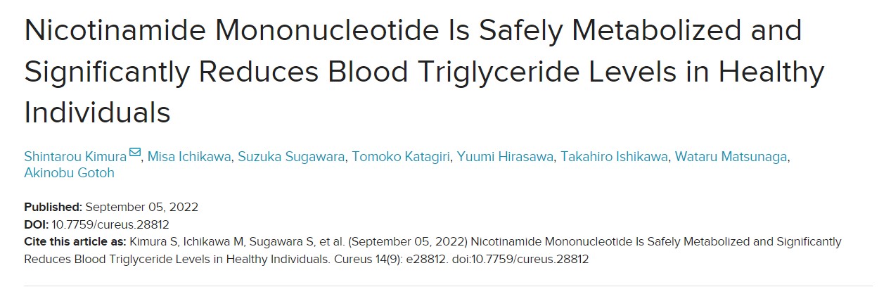 [1]. Kimura S, Ichikawa M, Sugawara S, et al. (September 05, 2022) Nicotinamide Mononucleotide Is Safely Metabolized and Significantly Reduces Blood Triglyceride Levels in Healthy Individuals. Cureus 14(9): e28812. doi:10.7759/cureus.28812