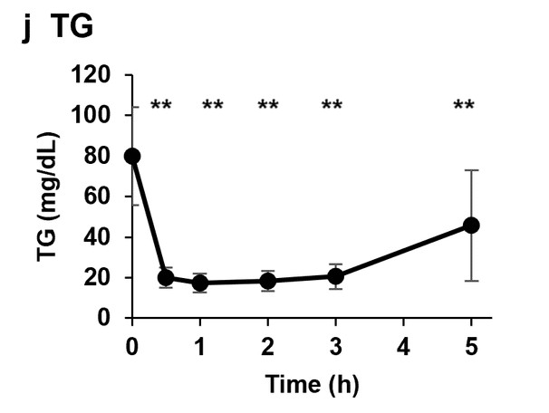 值得注意的是血液中甘油三酯水平发生了明显的变化,受试者在接受NMN注射半小时后,甘油三酯水平下降明显,一直到5小时后,虽有轻微的恢复趋势,但这种显著差异依然存在。