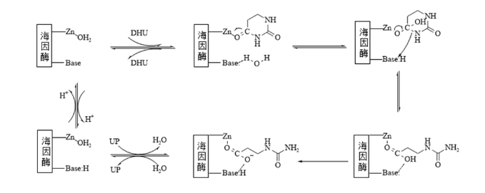 ①二氢尿嘧啶中的O-4会代替Zn2+-OH2上的H2O分子与Zn2+形成配位化合物;然后,海因酶结构上作为路易斯酸的金属离子Zn2+会极化底物的羰基并引起底物的水解。