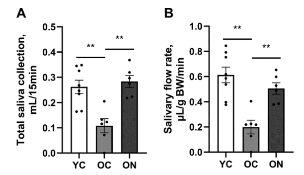 在盐水处理的对照组中,老年小鼠的总唾液分泌量和唾液流速明显低于年轻小鼠。然而,用NMN治疗的老年小鼠的总唾液分泌量和流速与用盐水治疗的年轻小鼠相当。