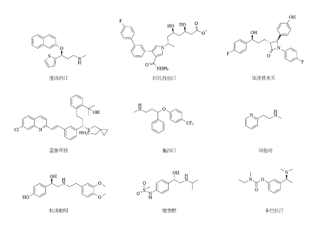 手性醇分子结构可作为度洛西汀、阿托伐他汀、依泽替米贝等多种手性药物的重要中间体,以手性醇为主要中间体的手性药物化学结构式如图1所示[4.5]。
